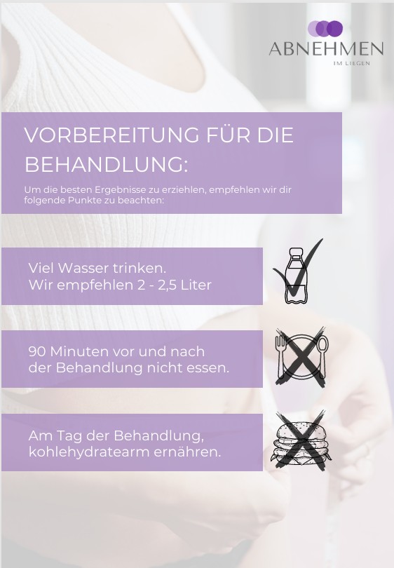 Außerdem solltest du in den letzten 24 Stunden vor der Behandlung in Summe 2 - 2,5 Liter trinken (zur empfohlenen Menge für das tägliche Trinken je Körpergewicht findest du weiter unten genauere Infos).